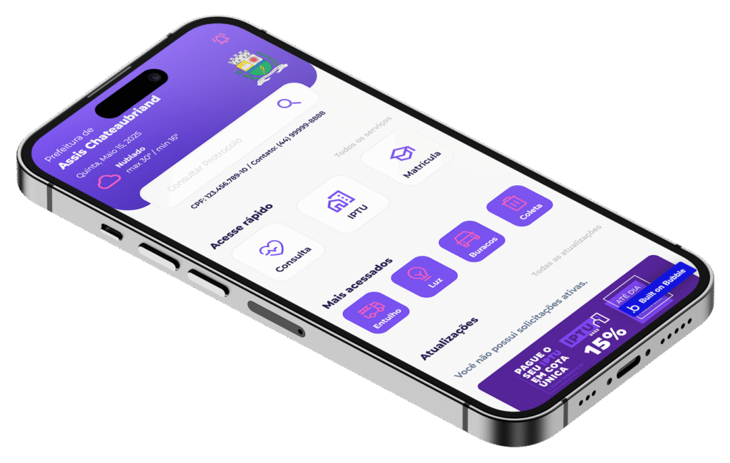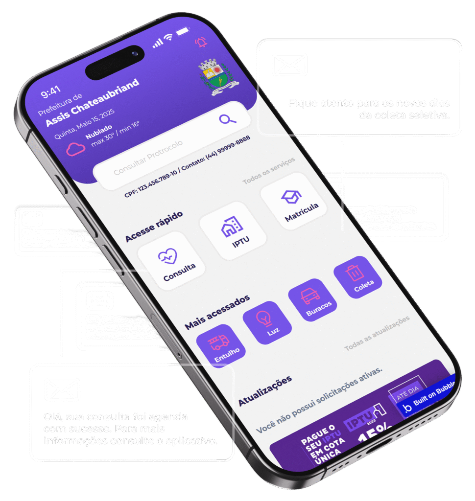 Agende serviços, resolva burocracias e reporte problemas urbanos de forma rápida e prática. Baixe agora e leve a prefeitura no seu bolso!